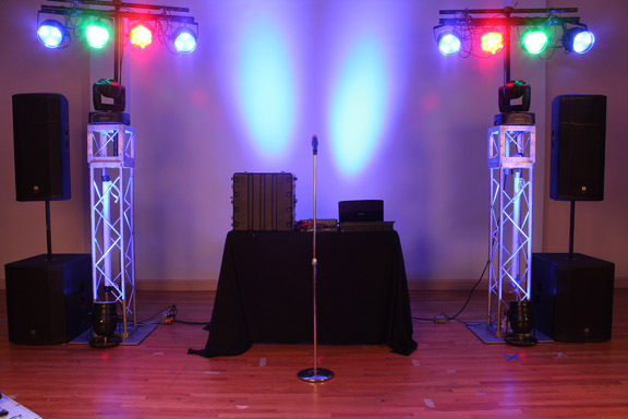 Our premier top of the line package suitable for larger venues and crowd sizes. This package is not charged by the hour, but rather comes complete with a five hour show of continuous music based on requests given by you, your group or organization and by the requests of the guests at the event. This package comes equipped with a state of the art, equalized concert series sound system with four speakers with subwoofers, a large sized lighting system all truss mounted with intelligent lights and an unlimited 75.000+ song title library on computer format. Your entertainment team consists of two appropriately attired, experienced adult disc jockeys. All systems are completely set up and operational before you and your guests arrive.